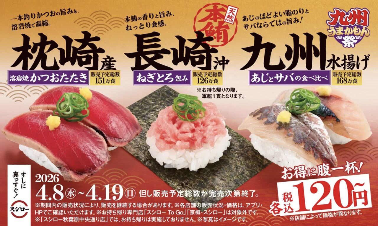 四街道にある「スシロー四街道店」では、九州各地の食材を使用したメニューが楽しめる『九州うまかもん祭』が、2026年4月8日(水)から2026年4月19日(日)までの期間限定で開催されることがわかりました。